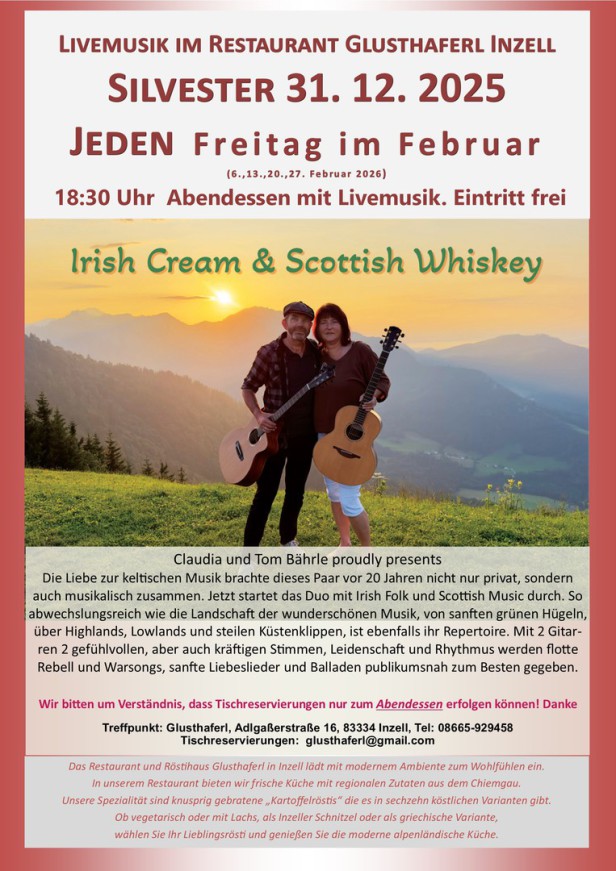 Mit 2 Gitarren 2 gefühlvollen, aber auch kräftigen Stimmen, Leidenschaft und Rhythmus werden flotte Rebell und Warsongs, sanfte Liebeslieder und Balladen publikumsnah zum Besten gegeben. Jeder Schottland- und Irlandfan kommt hier voll auf seine Kosten.